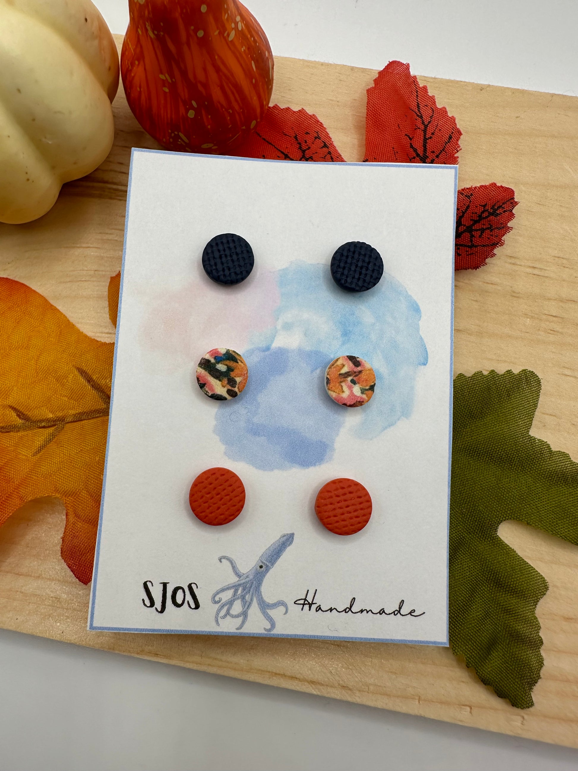 Lightweight polymer clay 3 circle stud pack with linen texture and pattern- Navy, Pattern, Orange