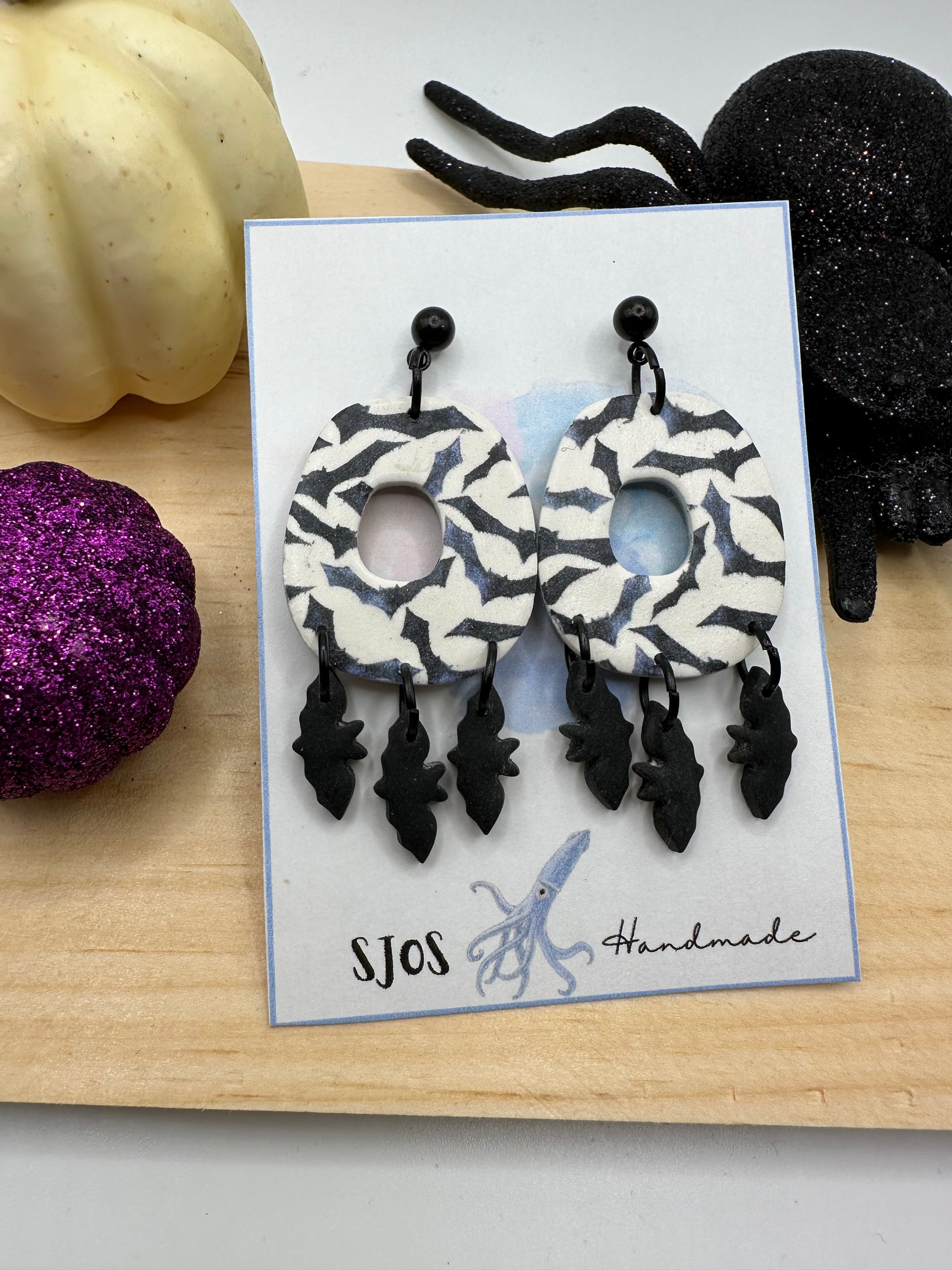 Lightweight polymer clay organic circle dangle with bat pattern and small bat dangles
