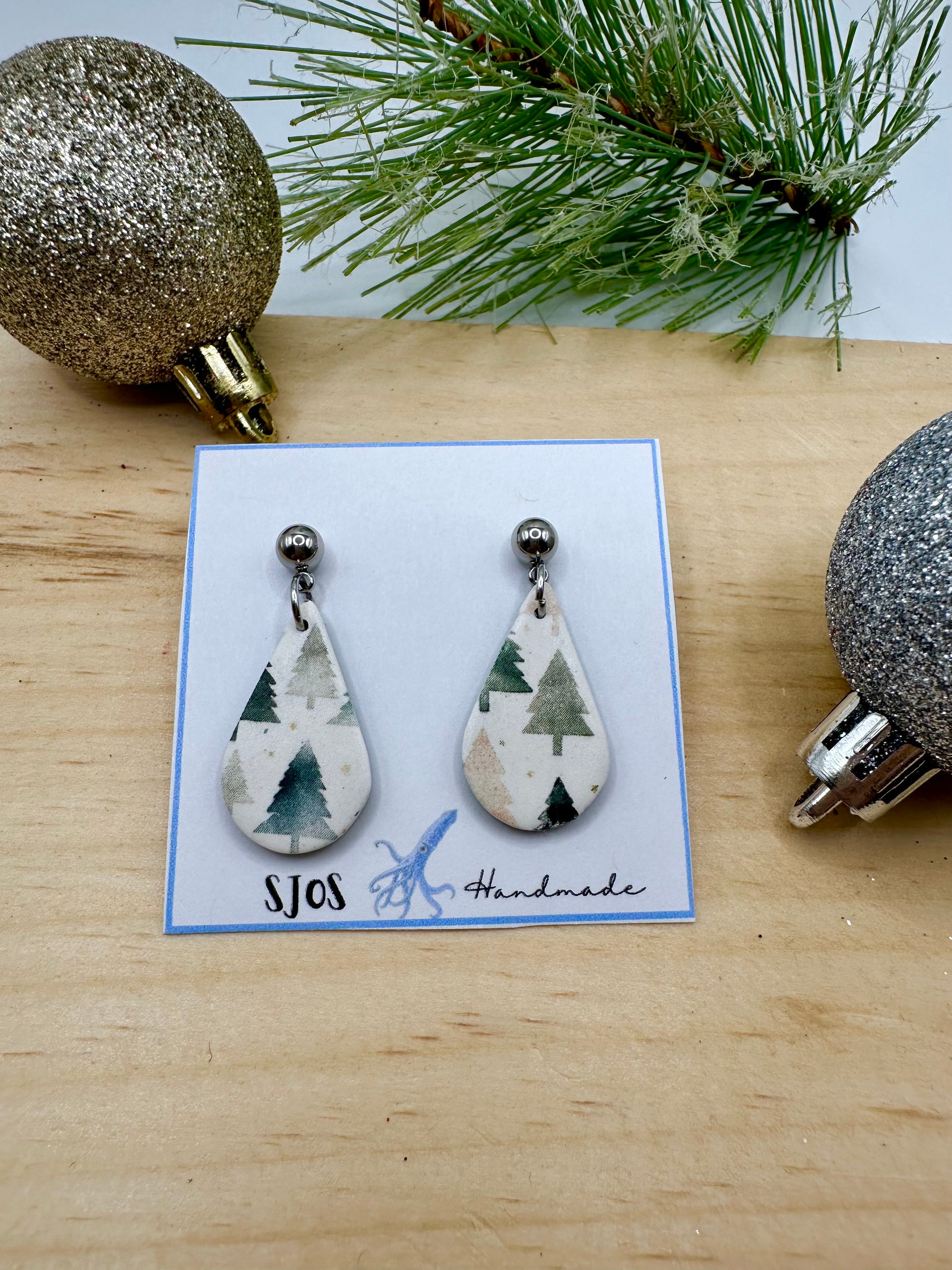 The Anne- Lightweight polymer clay small teardrop dangle with Christmas tree pattern, ball stud