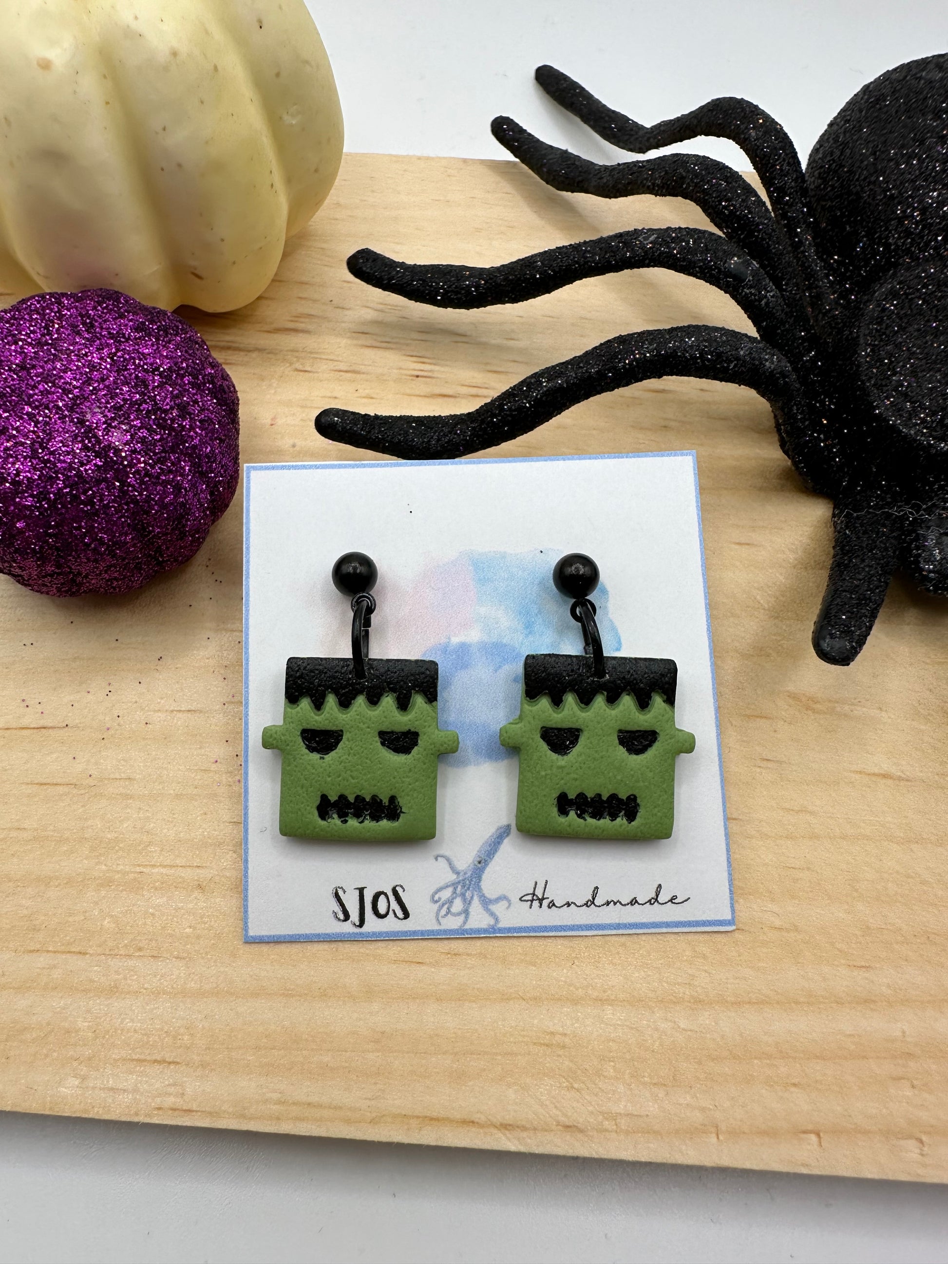 Lightweight polymer clay Frankenstein’s Monster dangle with black ball post finding