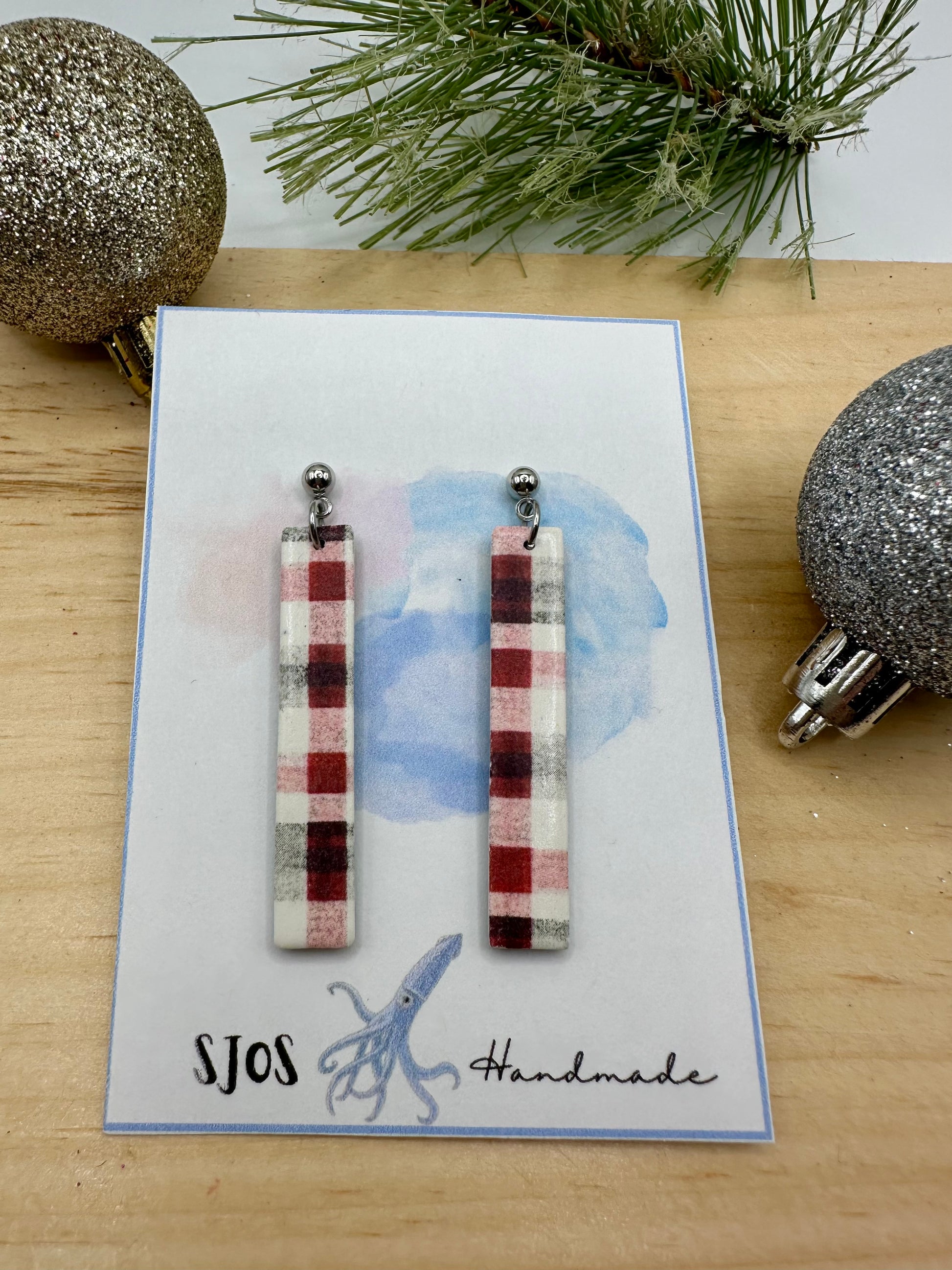 Lightweight polymer clay thin rectangle dangle with vintage, distressed plaid pattern, ball stud